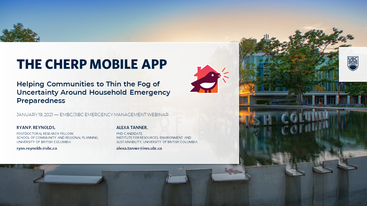Ryan and Alexa Tanner presented information about community resilience, household preparedness, behavioural biases, and how these come together in the CHERP mobile app.