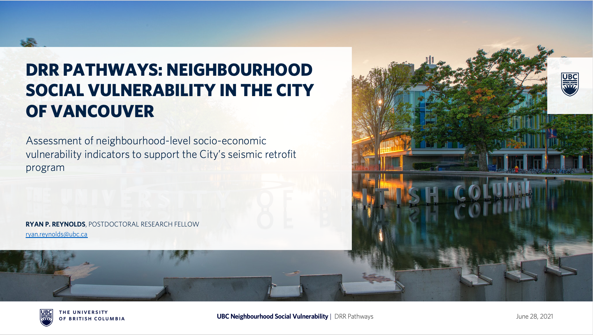 I was a Postdoctoral Research Fellow with the School of Community and Regional Planning team contributing to this project from its inception in 2019 through to its completion in June 2021. We were initially committed to just exploring neighbourhood vulnerability and risk dynamics, but later expanded to include the neighbourhood recovery and recoverability.